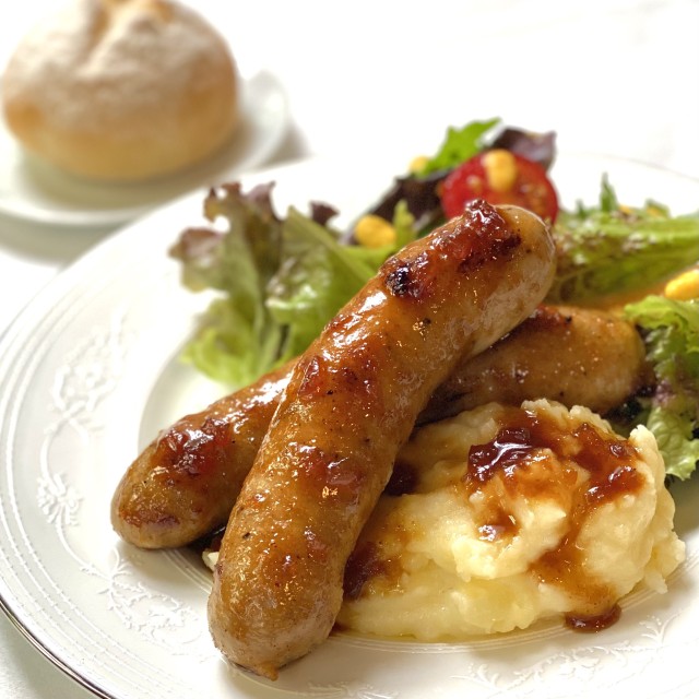 サラダ、ミルクブレッドロール1個付きソーセージ&マッシュ